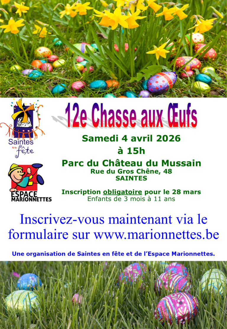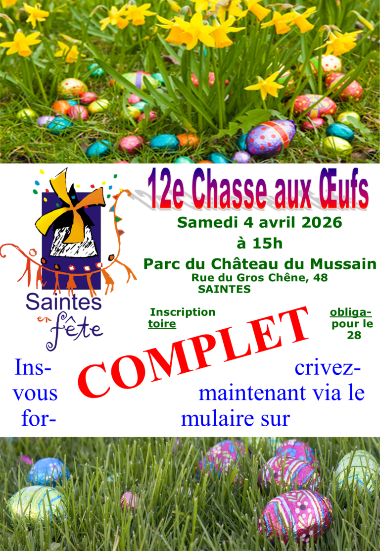 L’équipe de Saintes en Fête vous invite à la nouvelle édition de sa grande chasse aux œufs qui aura lieu le samedi 4 avril 2026 à 15h au Parc du Château de Mussain.